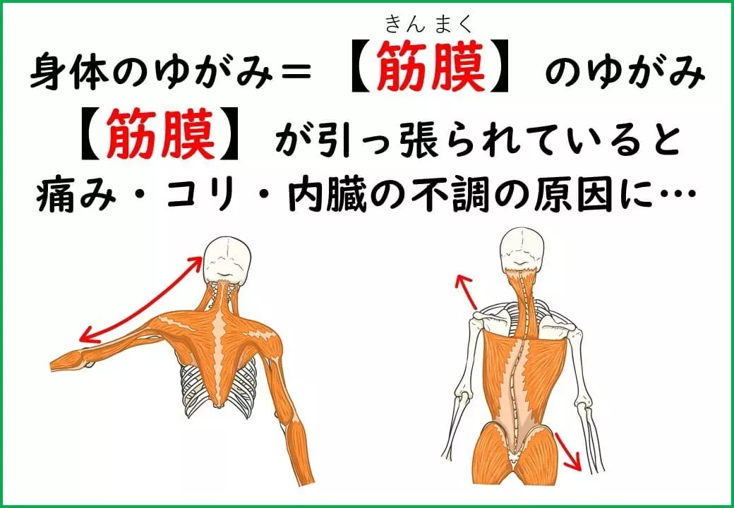 筋膜は筋肉・骨・内臓などにもつながっていて、筋膜のゆがみは全身に影響を与えてしまいます。