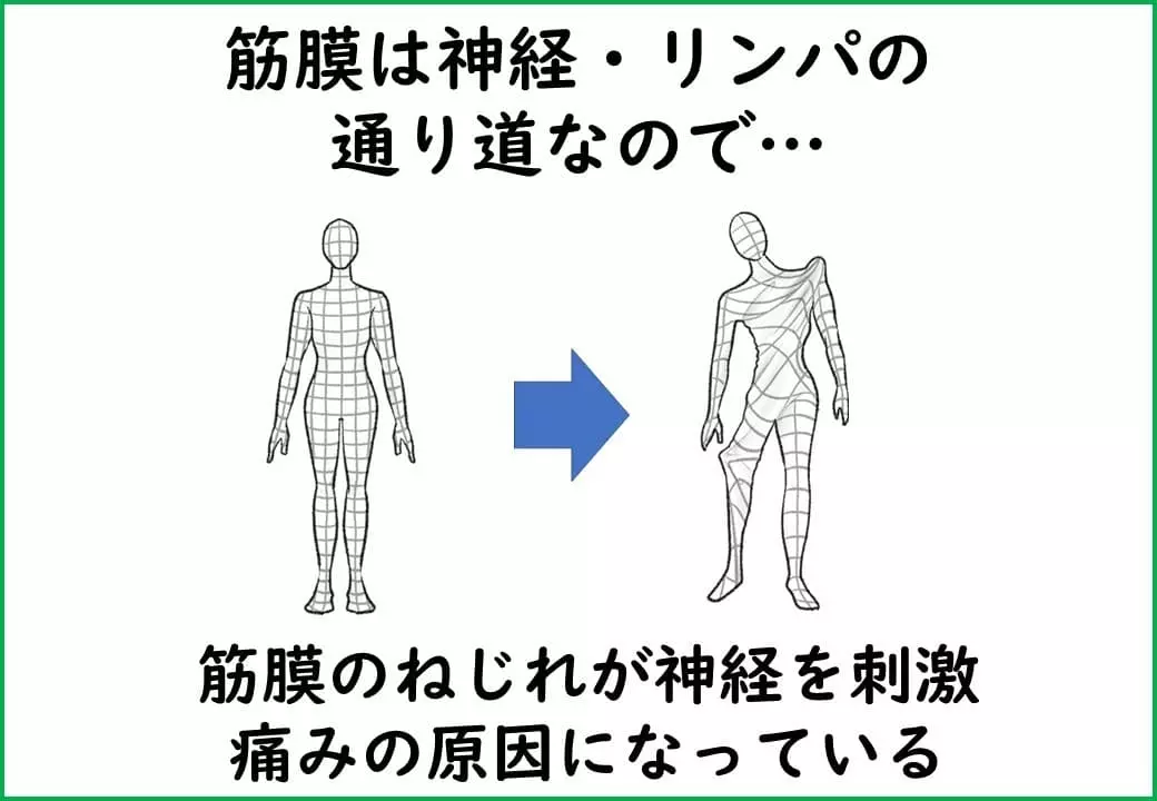筋膜には痛みを感じるセンサーがあり、筋膜のねじれが痛みを感じさせている原因になっていることが多いです。