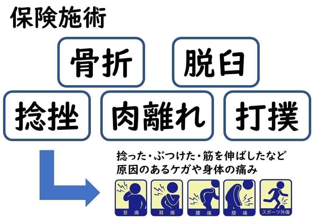 また、仕事が原因での痛みは労災扱い(もしくは自費施術)、交通事故の場合は自賠責保険の適用となります。